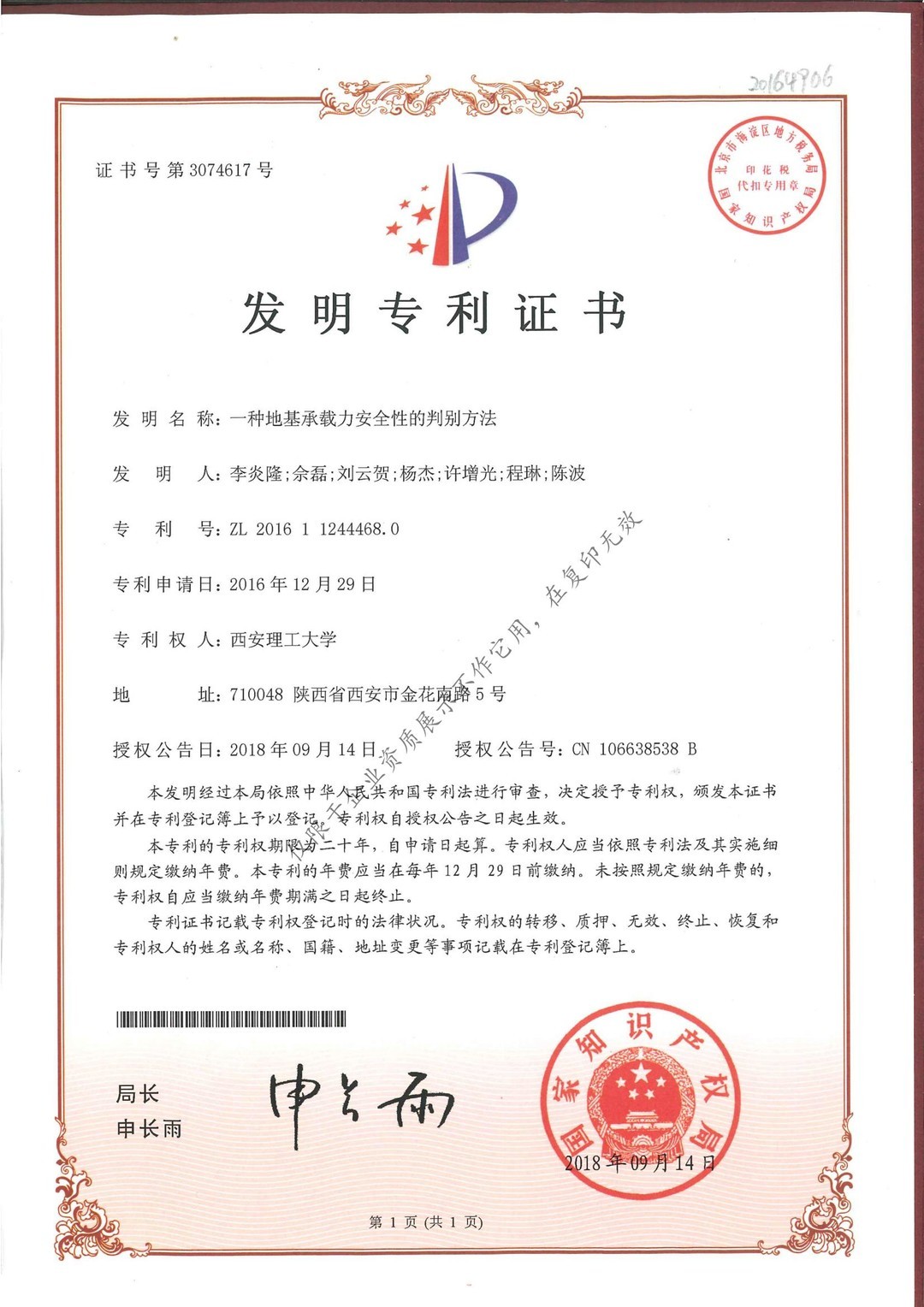 發明專利證書 轉讓證明:一種地基承載力安全性的判別方法