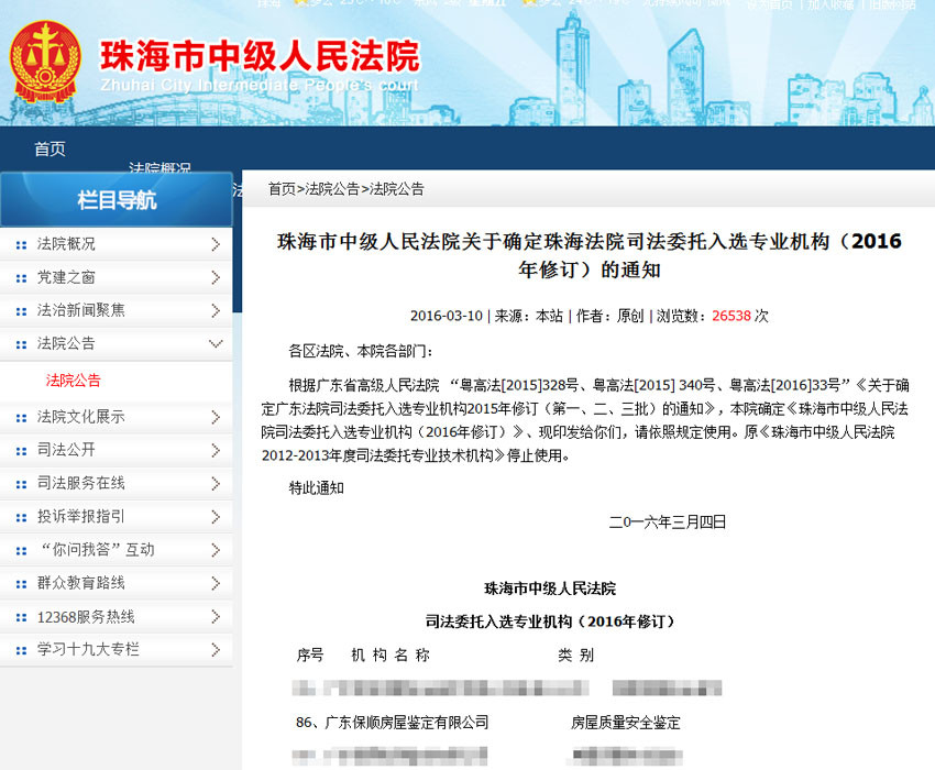 按照粵高法[2015]114號《廣東法院司法委托入選專業機構(2015年修訂)的基本條件》,經過法院審查核實,我司順利入選“珠海中級法院”司法委托專業機構名錄。