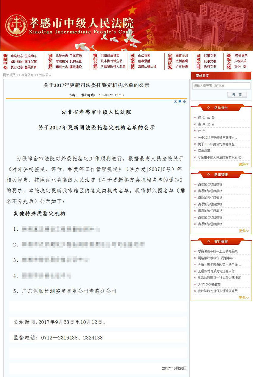 根據(jù)最高人民法院《對外委托鑒定、評估、拍賣等工作管理規(guī)定》(法辦發(fā)[2007]5號)的相關(guān)規(guī)定,現(xiàn)決定公告自愿報(bào)名,經(jīng)省高、中級法院審核通過的司法委托鑒定機(jī)構(gòu)名單,自2018年1月1日起啟用,廣東保順檢測鑒定有限公司作為全省各級人民法院司法委托鑒定的備選機(jī)構(gòu)。