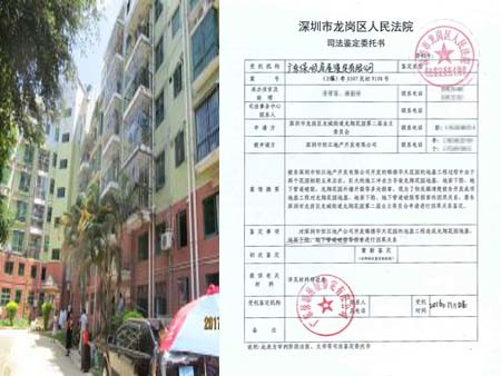 由深圳市龍崗區(qū)人民法院審理的深圳市龍崗區(qū)龍城街道龍翔花園第二屆業(yè)主委員會與深圳市恒江地產(chǎn)開發(fā)有限公司糾紛一案中,因案情需要,受深圳市龍崗區(qū)人民法院的委托,我司對深圳市恒江地產(chǎn)開發(fā)有限公司錦繡華天花園的地基工程與龍翔花園1棟5、6單元房屋上部結(jié)構(gòu)開裂的因果關(guān)系進(jìn)行房屋檢測鑒定。