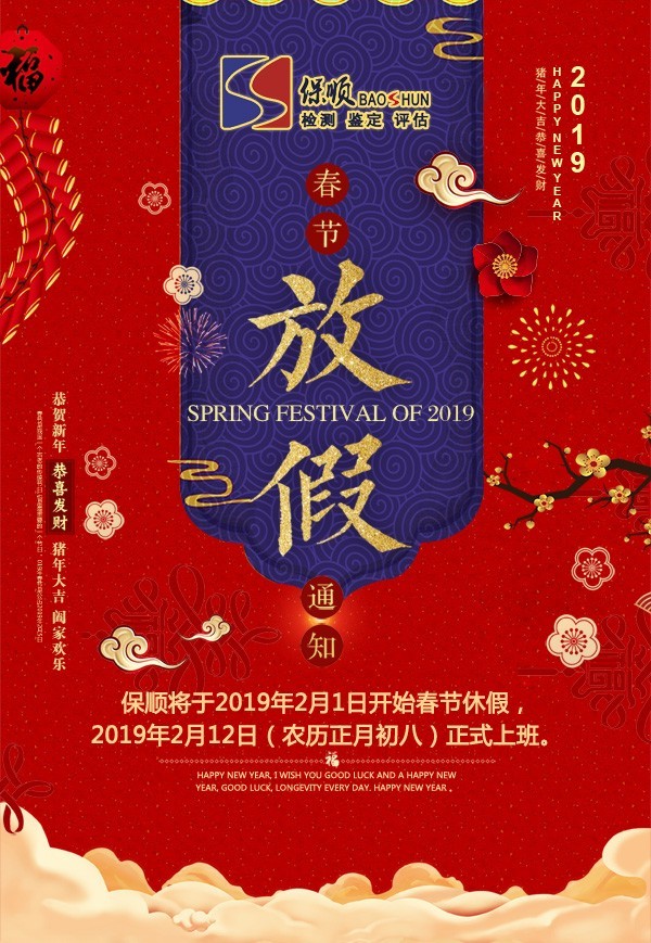 廣東保順檢測鑒定有限公司將于2019年2月1日開始春節(jié)休假,2019年2月12日(農歷正月初八)正式上班。祝您假期愉快,2019年“豬”事順利!