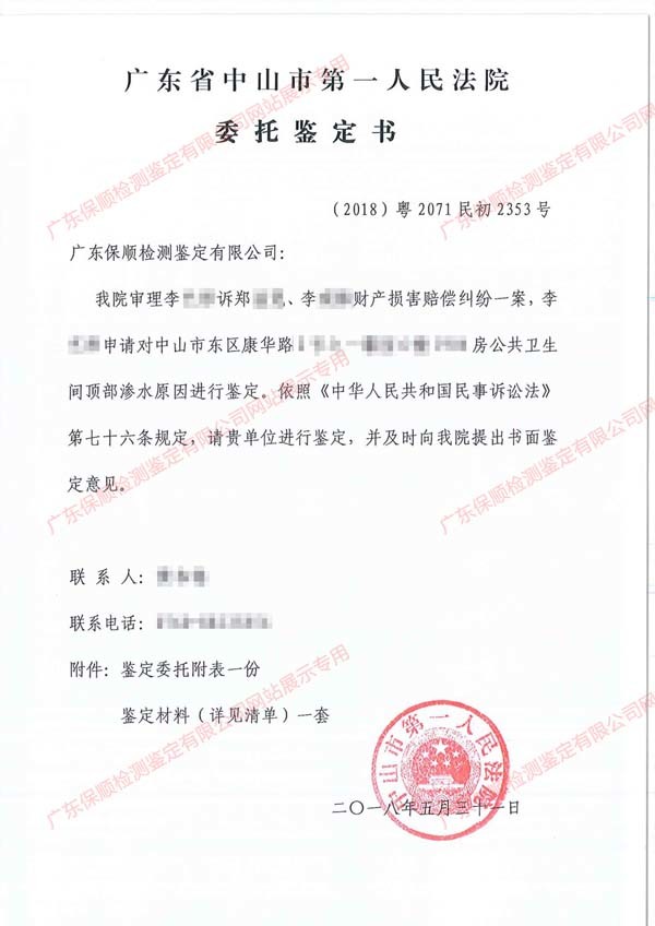 由廣東省中山市第一人民法院審理的原告李**與被告鄭**、李**財產損害賠償糾紛一案,因案情需要,廣東保順檢測鑒定有限公司對中山市東區康華路2號**房公共衛生間頂部滲水原因進行鑒定。
