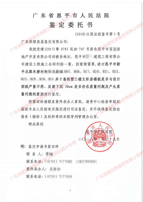 由廣東省恩平市人民法院委托的(2018)平法委鑒字第23號原告恩平市**房地產(chǎn)開發(fā)有限公司訴被告林*、恩平市**建筑工程有限公司建筑工程施工合同糾紛一案。因案情需要,受廣東省恩平市人民法院的委托,廣東保順檢測鑒定有限公司派員對恩平市新平北路的十套別墅進行工程質量鑒定。