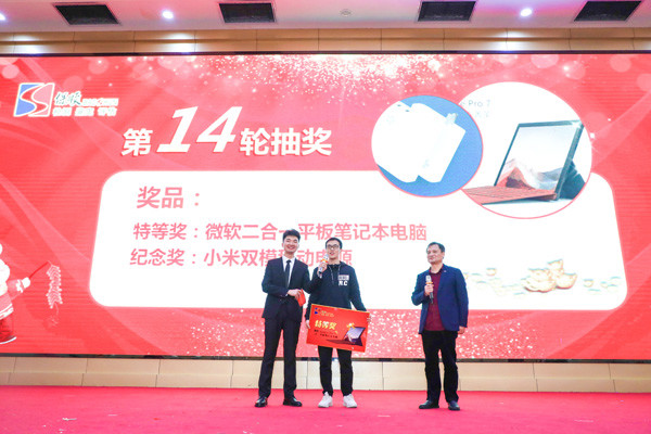 年會全程穿插十四輪抽獎環(huán)節(jié),筆記本電腦、手機(jī) 、單反相機(jī)等總值超過10萬元的三百多件獎品輪番抽!