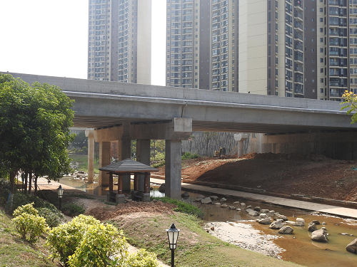 廣州綠地城跨流沙河中橋位于廣東省廣州市黃埔區。橋梁全長77.2m,橋面總寬28.0m,橫向布置為:綠化帶(0.50m)+防撞護欄(0.50m)+人行道(4.50m)+行車道(7.75m)+中央分隔帶(1.50m)+車行道(7.75m)+人行道(4.50m)+防撞護欄(0.50m)+綠化帶(0.50m)。橋面鋪裝為瀝青混凝土。上部結構為2×35m預應力混凝土小箱梁:下部結構橋臺為0#橋臺為扶壁式橋臺配樁基礎,2#橋臺為埋置式樁接蓋梁橋臺,橋墩為雙柱式樁柱式橋墩。橋梁概貌如照片1.1.1、1.1.2所示。
