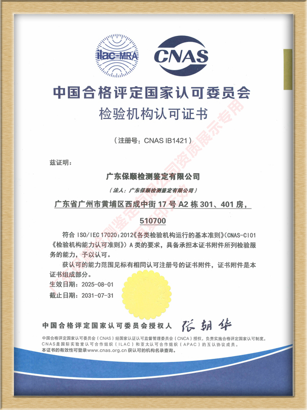 中國合格評定國家認可委員會作為由國家市場監督管理總局批準設立并授權的國家認可機構,CNAS認可過程嚴格參照國際標準 ISO/IEC 17011 執行。雙項國家級認證的取得,意味著廣東保順檢測鑒定有限公司在檢測鑒定技術能力、質量管理體系、人員專業素養以及設施設備等多方面,均達到了國內乃至國際認可的高水平。