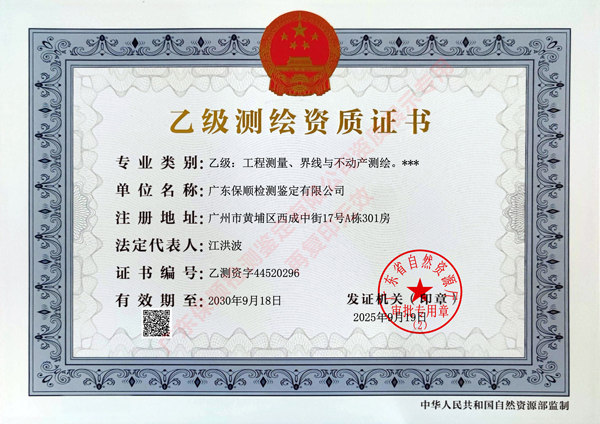 2025年9月,廣東保順檢測鑒定有限公司正式通過廣東省自然資源廳審批,成功獲批乙級測繪資質證書。