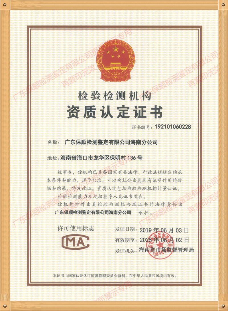 海南分公司CMA檢驗檢測機構(gòu)資質(zhì)認(rèn)定證書