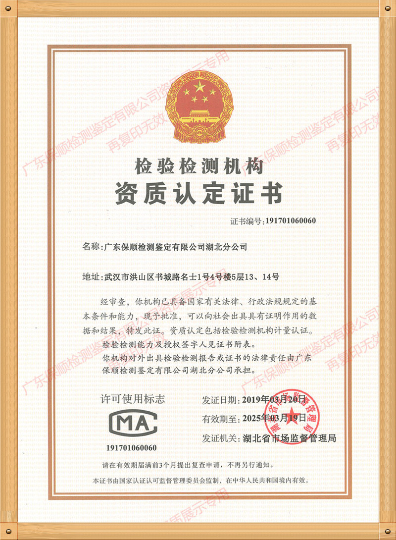 湖北分公司CMA檢驗檢測機構(gòu)資質(zhì)認(rèn)定證書