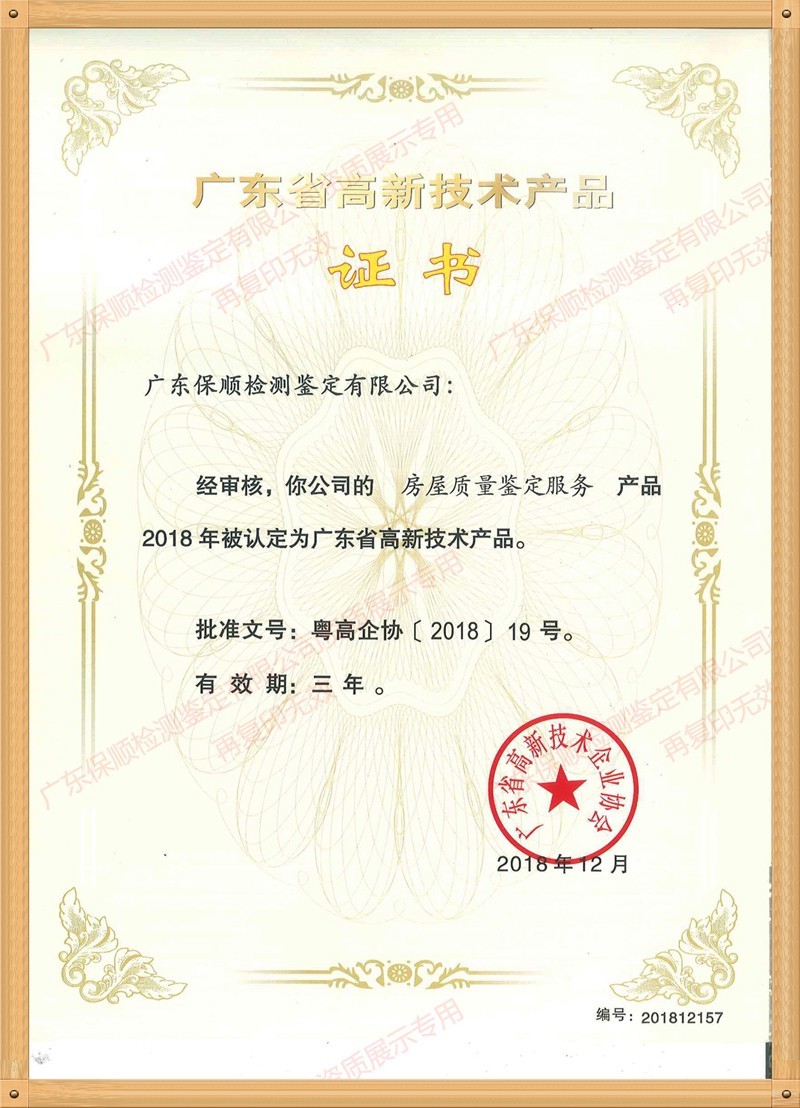 廣東省高新技術(shù)產(chǎn)品證書-房屋質(zhì)量鑒定服務(wù)